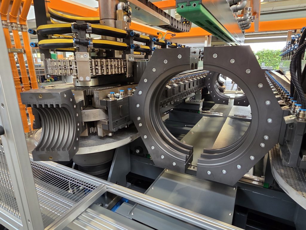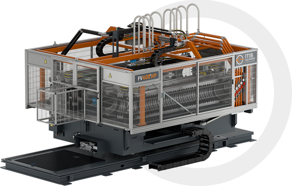 The choice to include the ID, 400mm, is highlighted by the “+” sign. Some more space is in mould dimensions to allow the production of pipes with in-line socketing as well. The range is from 3” ID up to 15” ID for Countries based on imperial sizes like USA. One of the main technical features of the new equipment is the possibility to use the same moulds and tools of the FV200HP, giving customers great production flexibility. All the most updated solutions already used in the smaller model are also available in the FV400+HP.